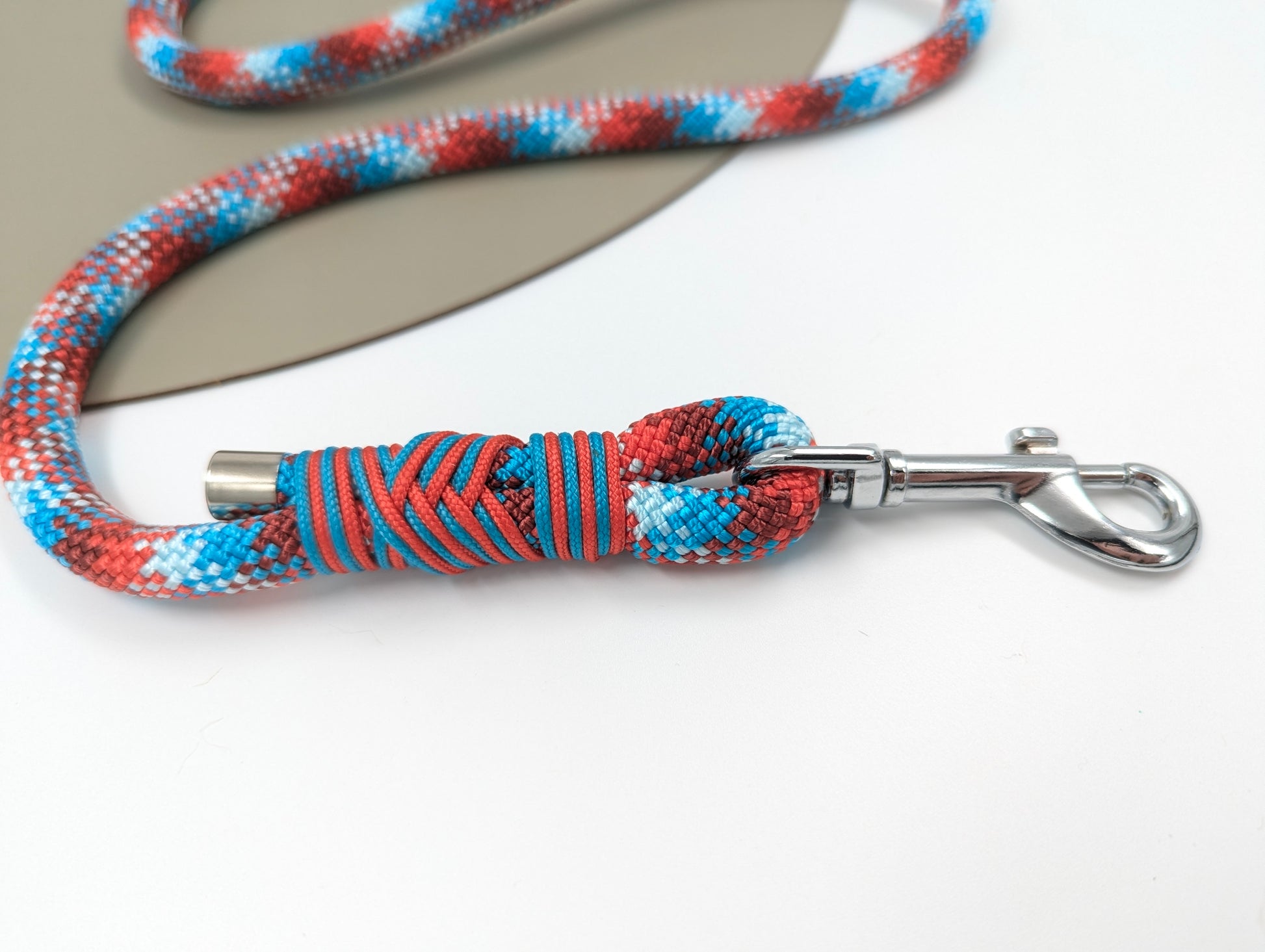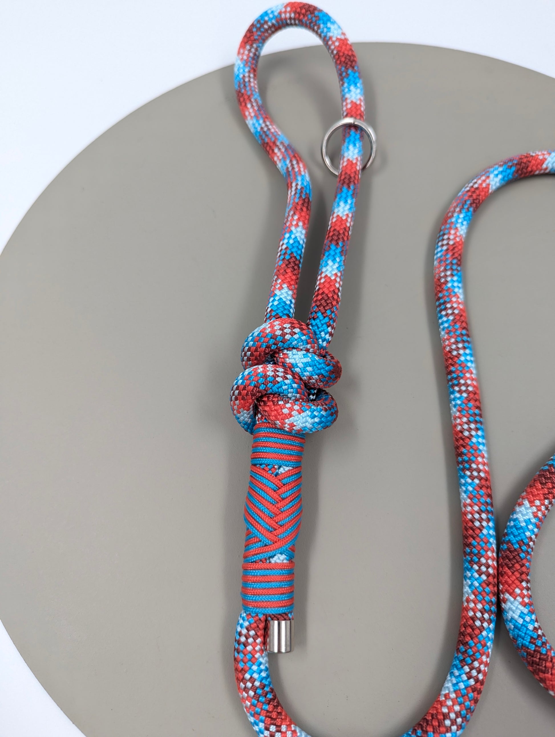An Octoknot rope lead in blazed ice rope, mixed blue and red whipping.
