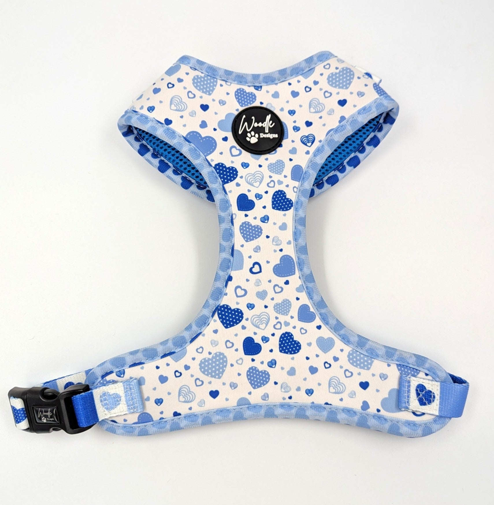 Each piece features a beautiful, romantic pattern of blue hearts on a soft, creamy background. The set comprises of a harness, sailor bow, blanket, waste bag holder, handmade lead with a UV printed BioThane handle and a handmade BioThane collar. All crafted for comfort, durability, and a truly adorable look.